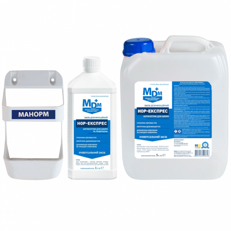 Комплект поєднує каністру дезінфекційного засобу «НОР-експрес» 5 л, засіб «НОР-експрес» 1 л з дозатором для зручного щоденного користування та настінний універсальний пляшкотримач у подарунок. Рішення ідеально підходить для регулярної, швидкої та ефективної дезінфекції рук і поверхонь у медичних, робочих та домашніх умовах.
