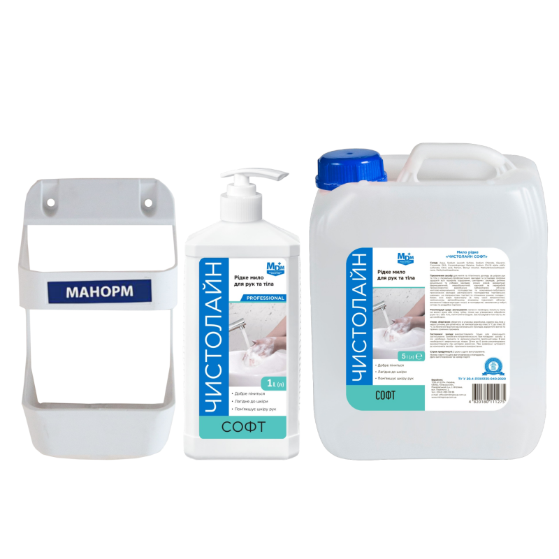 Готовий комплект для організації зони миття рук із можливістю швидкого поповнення. У наборі — рідке мило «Чистолайн Софт» у двох об’ємах (1 л для щоденного використання та 5 л для поповнення) і настінний пляшкотримач, який дозволяє зручно розмістити засіб у зоні доступу. Підходить для системного використання в громадських і робочих просторах.