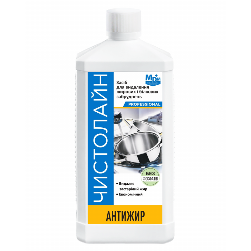 Миючий засіб «Чистолайн Антижир» — це концентрований прозорий лужний засіб із оптимальним вмістом натрію гідроксиду, органічного розчинника та неіоногенних ПАР, призначений для швидкого й ефективного видалення стійких жирових, білкових і коптильних забруднень, нагару та кіптяви з емальованих, керамічних, скляних і нержавіючих поверхонь, а також обладнання термічної обробки. Засіб не містить фосфатів і безпечний для обладнання й навколишнього середовища.