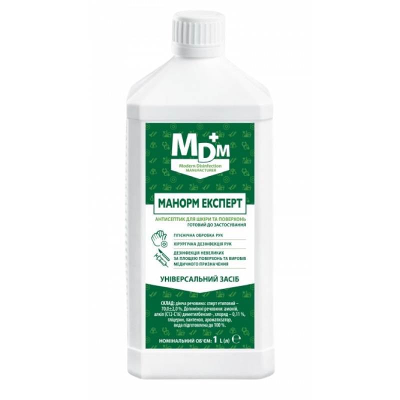 Манорм Эксперт — высокоэффективное дезинфицирующее средство на основе 70% этилового спирта и 0,11% четвертичных аммониевых соединений, предназначенное для гигиенической и хирургической дезинфекции рук, антисептической обработки кожи, профилактики грибковых заболеваний стоп, а также быстрой дезинфекции небольших поверхностей и медицинского инструментария. Средство не пересушивает кожу, содержит увлажняющие компоненты, не оставляет липкого слоя и обеспечивает пролонгированное антимикробное действие до 3 часов.